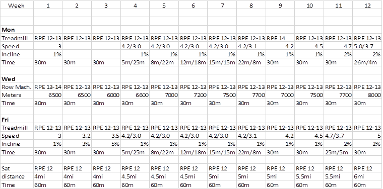 Example: Scott is 40 and wants to improve his health after going to his MD and getting a recommendation to start being more physically active. He is sedentary and has been for the past 15 or so years, outside of his daily tasks including yard and housework, with a history of walking, running, and sports in high school. Scott is motivated after his visit with his MD and recently got a membership at a local fitness facility. He expounds on his schedule and decides that he can commit to going to the fitness facility ~60 minutes 3 days per week (Monday, Wednesday, Friday) and walk on Saturday morning with his wife for about an hour. He also states that he enjoyed running/walking on the treadmill many years ago and wants to get back to that, he is not interested in recreational activities, and is not opposed to other modes such as biking or rowing. Using this information Scotts plan is to do 30 minutes of aerobic exercise using the treadmill and row machine on Mondays, Wednesdays, and Fridays at the fitness facility and walk with his wife Saturday mornings for 60-minutes all at an ~RPE 12-13 (that’s 150 minutes/week of moderate aerobic exercise). As he gets more fit, he must increase his intensity to maintain that same RPE range, and even starts to run around week 4. His 3-month progress is below (Scott also plans to resistance train on those days as well but is not shown here).