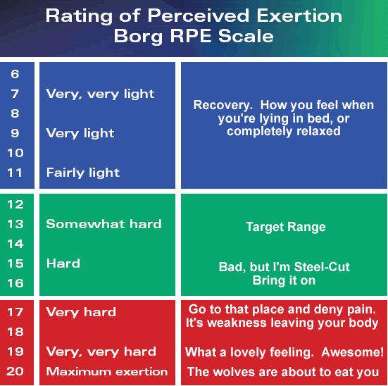 Cardiovascular exercise (also referred as aerobic exercise or conditioning) can be simply defined as an activity that gets your heart rate up and keeps it up. Examples could include cycling, walking, running, rowing (machine or actual boat), tennis, dancing, snow shoeing, and the list goes on. Often you will hear words like “continuous” and “rhythmic” when you read about attributes of cardiovascular exercise; because if an activity meets those criteria, it will likely be good at keeping your heart rate up. I tend to push people toward cardiovascular exercises that they enjoy, have access to, and do not give them too much discomfort. For example, if someone doesn’t have access to a treadmill, gets pain in their knees on the treadmill, and dislikes the treadmill, then the treadmill is likely not going to be a good option for a cardiovascular exercise modality. However, if someone has a friend who plays pick up racquetball at a club, the person is a member of the club, they like racquetball, and tolerate it well, then racquetball would be a great choice for this person. So, how much of that stuff do you need to be doing for general health? We all need to be participating in at least 75 -150min/week of vigorous exercise or 150-300 minutes a week of moderate exercise. The terms “moderate” and “vigorous” refer to how tough the exercise is, but how do we decipher what is light, moderate, or vigorous? Well, a lot of ways: Mets, Watts, subjective intensity, heart rate, and even an assessment of ones talking capabilities. However, I think the most useful and simplest is one’s subjective intensity, or how hard you feel the exercise is. The idea behind subjective intensity is that you would use a scale, either in your mind or in front of you, to assess how hard the exercise is, and trying to stay within a certain range. There are various scales but the two most common are the 0-10 scale (CR-10) and the 6-20 “BORG” scale. I tend to use the 6-20 BORG scale for clients and patients when determining how difficult their cardiovascular training is, but I don’t think it matters too much if you use the same scale every time. Moderate intensity would be a rating of ~12-13 on the BORG scale and vigorous intensity would be a rating of ~15-16 on the BORG scale. So, when prescribing someone, or yourself, a cardiovascular exercise regimen for general health you should think about what would be best to do, how hard is that going to be using our subjective ratings of intensity scales (moderate? Vigorous?), and then start at the bottom of the recommendation for that intensity and work your way up to the latter end taking account of not only subjective rating during the activity but also subjective rating throughout the week to decide when to increase your minutes per week. Below is an example of how I might set someone up with a cardiovascular regimen for general health and their progress.