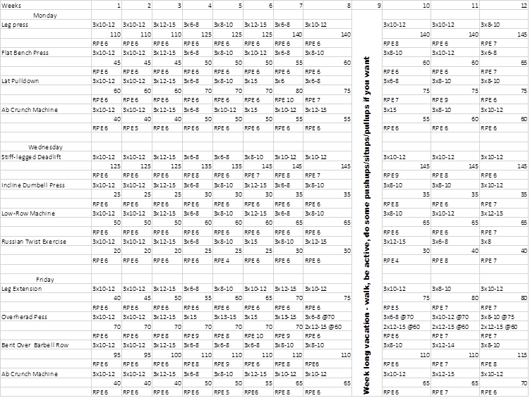 This is an example routine of a middle-aged man who came to me to improve his health who had very little resistance training experience but had been going to a fitness facility for a few weeks, had already received an orientation, but didn’t have a formal plan. The total volume is about 9-12 sets/muscle group/week, depending on the muscle group in question, and the rep range for all the exercises stayed between 5-15. RPE fluctuated but averaged RPE 6-7. On a few occasions RPE for an exercise drifted into the 8-9 range. When this happened, we simply kept everything the same for the next week and assessed again. In one instance an exercise acted “troublesome” and continued to be an RPE 8-9 and didn’t progress, the Overhead Press on Friday’s. You can see by week 6 the client has stalled out for multiple weeks fluctuating between 10-15 reps with higher RPEs than we want. Instead of adding another pushing exercise, we simply added another 2 sets at a lighter intensity hoping that the increased volume would lead to come changes in that muscle group and exercise specifically. This is just one example of how you might combat this.