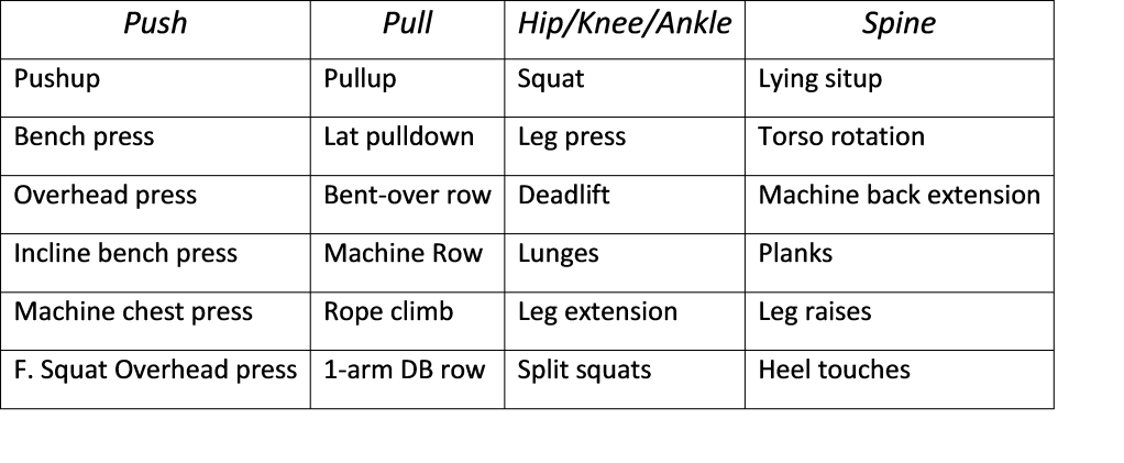 So, the classic recommendation here is “6-10 exercises working major muscle groups.” I personally frame it this way: We want to work all of our muscles, muscles work together to move our bones, our bones are connected at our joints, so we need exercises that involve bending all of joints in different ways to work all of our muscles. To me, this is simply pushing, pulling, bending hips/knees/ankles, and bending our spine. If you do those movements in some diverse ways, you will have successfully put resistance on all your muscles. When picking exercises that match these movement types, preference, discomfort, access, and other factors become important. Also, one exercise may fall into multiple categories. For example, a Squat and Deadlift both involve hip/knee/ankle bending but they also put a lot of resistance on the muscle involved in bending the spine. Likewise, the Bent-over Row exercise is a pulling exercise that will also put a fair amount of resistance on the spine muscles as well. Finally, the front-squat-overhead press is an exercise that combines the hip/knee/ankle bending Squat exercise with the overhead pressing (pushing) exercise. I normally start someone off with 2 different exercises per movement type on separate days and then build from that depending on tolerance and progression. As time goes on a person should sprinkle some variety in there and challenge themselves with new exercises. Examples of some exercises and their respective categories are below (P.S. they are all Googleable via their listed names).